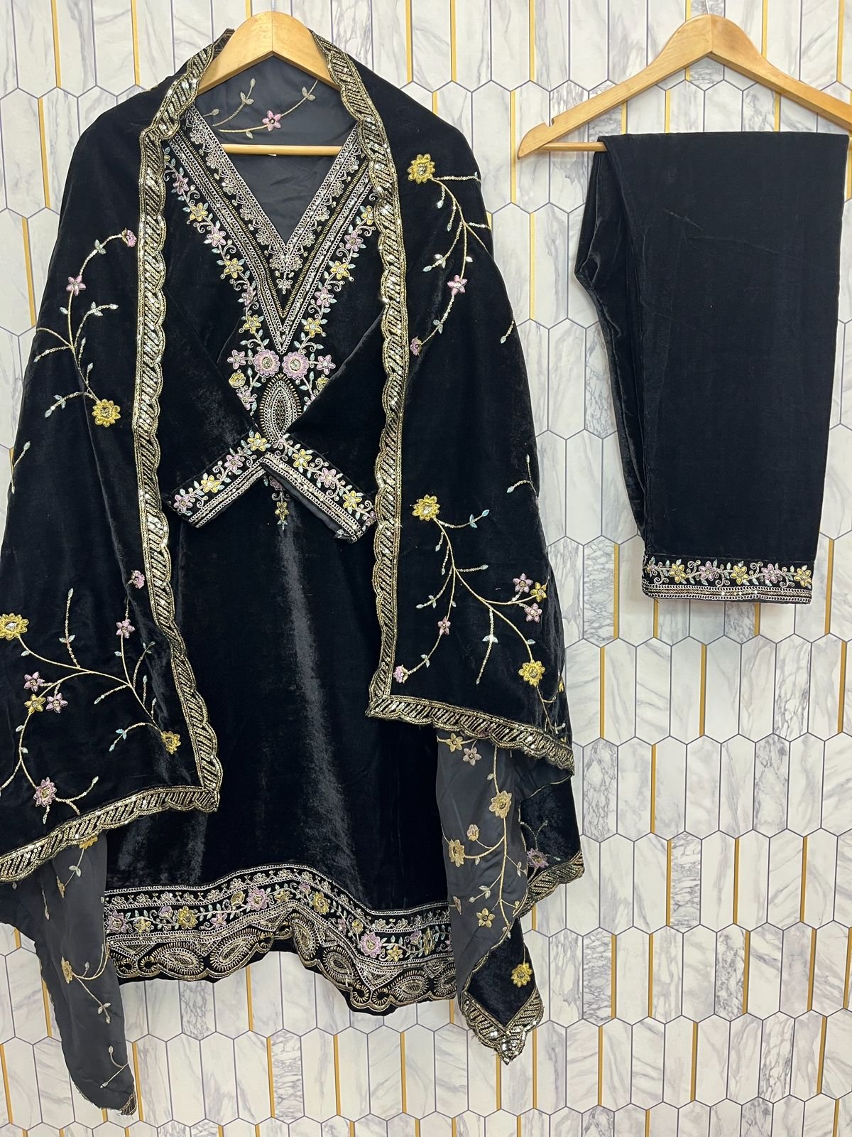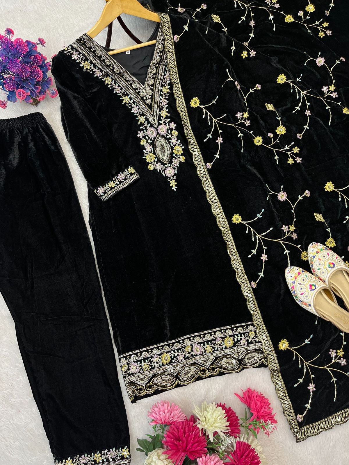 This three-piece fully stitched set includes a black velvet top, matching bottom, and embroidered dupatta, each adorned with delicate sequence and thread embroidery that gives it a royal and refined look.
