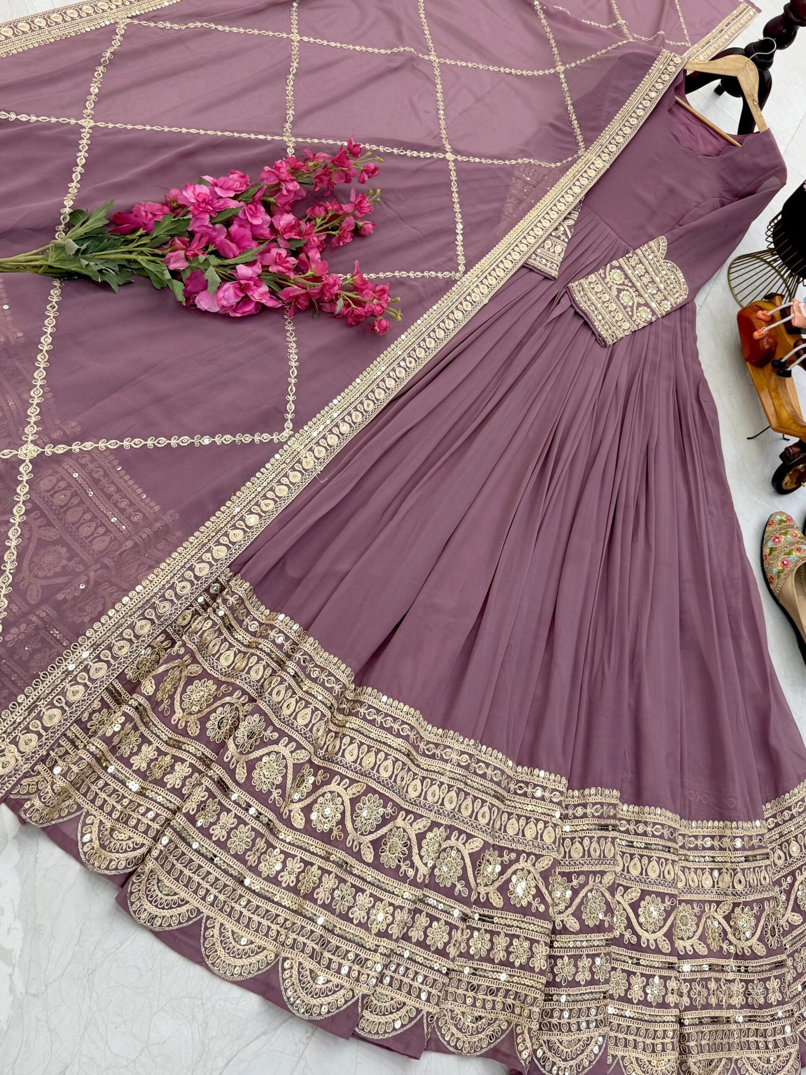 Crafted from premium Fox Georgette, the gown features heavy coding embroidery with delicate sequin detailing, giving it a radiant festive glow. The full-flair design flows beautifully, while the Micro Cotton inner lining with cups and zipper closure ensures a perfect fit and lasting comfort.