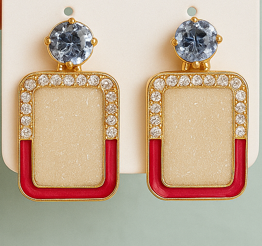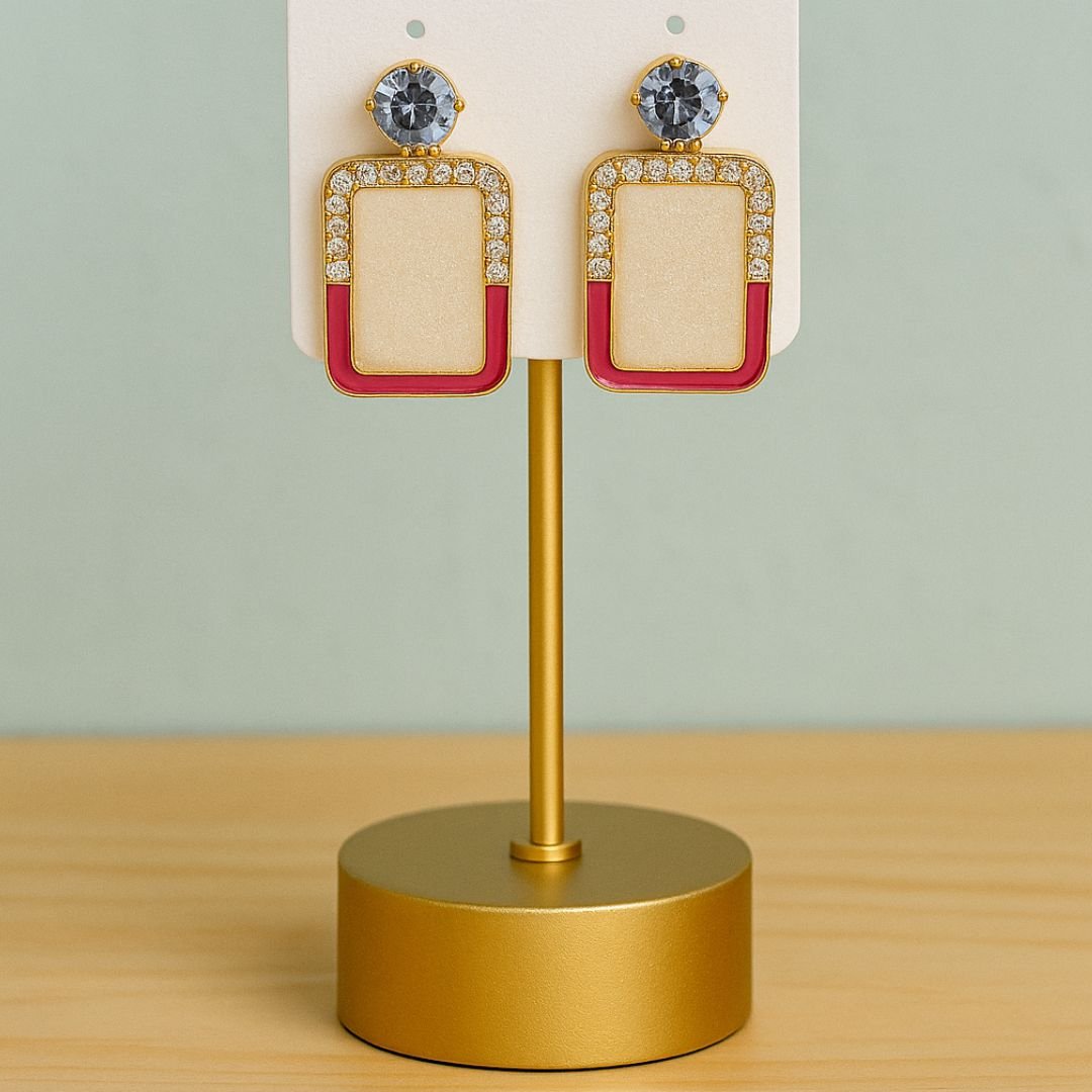 Bring timeless elegance to your collection with these stylish rectangular crystal earrings, crafted to add sparkle and sophistication to any outfit. The earrings feature a dazzling crystal stud at the top, beautifully connected to a rectangular pendant design outlined with shimmering rhinestones. The inner portion is finished with a soft off-white stone texture, while the bottom edge is highlighted with a subtle pink enamel touch for a modern twist.