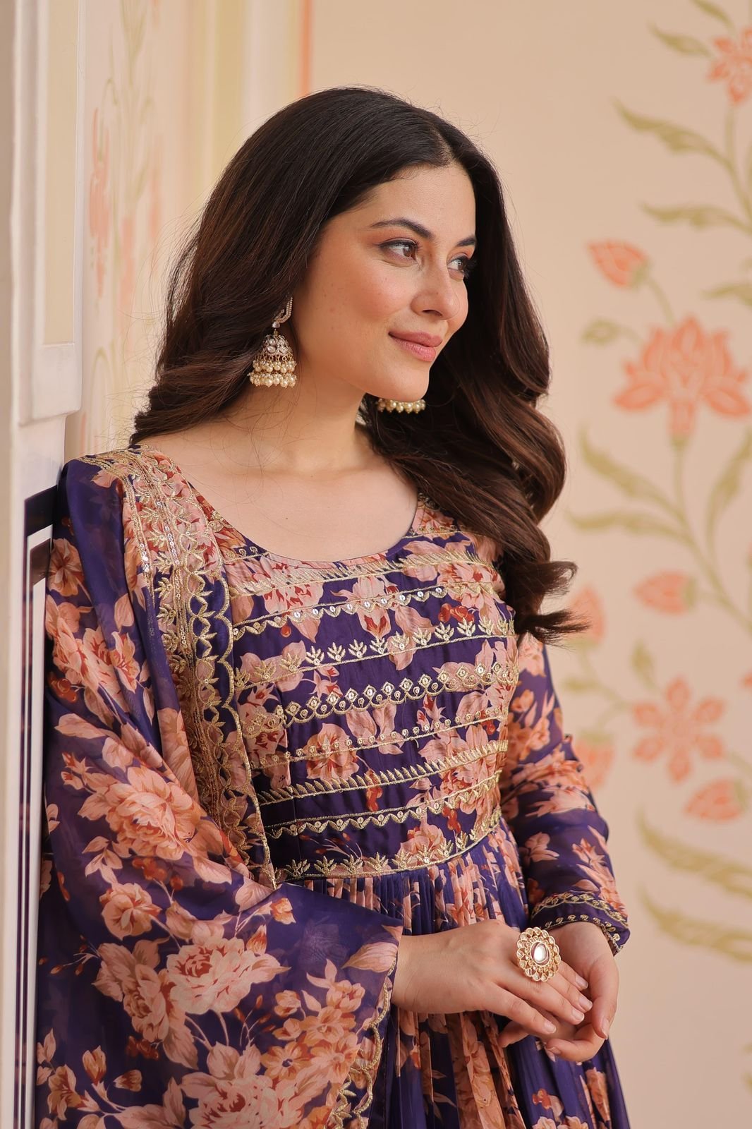 This luxurious gown features rich digital floral prints and sequined embroidery over Russian Silk fabric, adding a touch of royalty to your festive wardrobe.