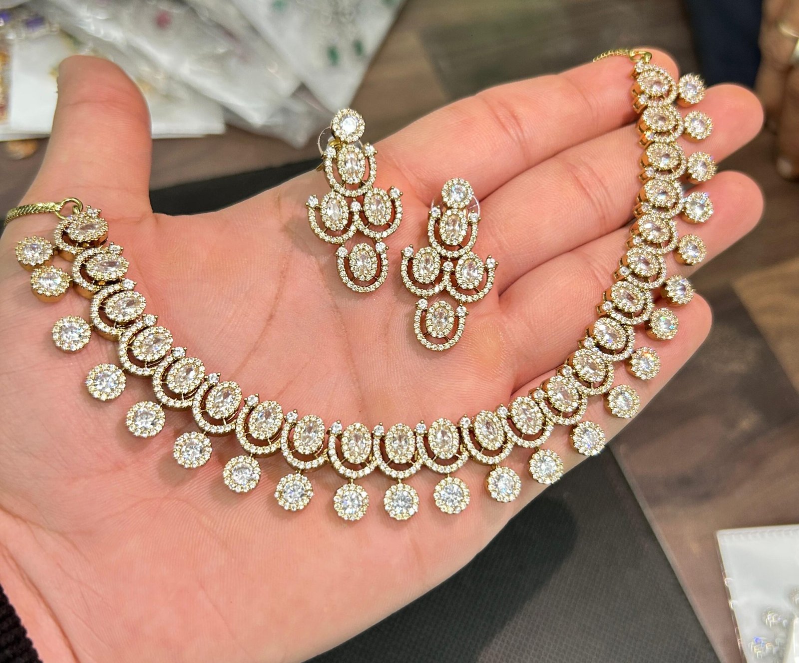 A premium diamond-studded choker necklace with matching earrings, crafted in gold plating to bring timeless elegance and sparkle to your style. Perfect for weddings, parties, and festive occasions.