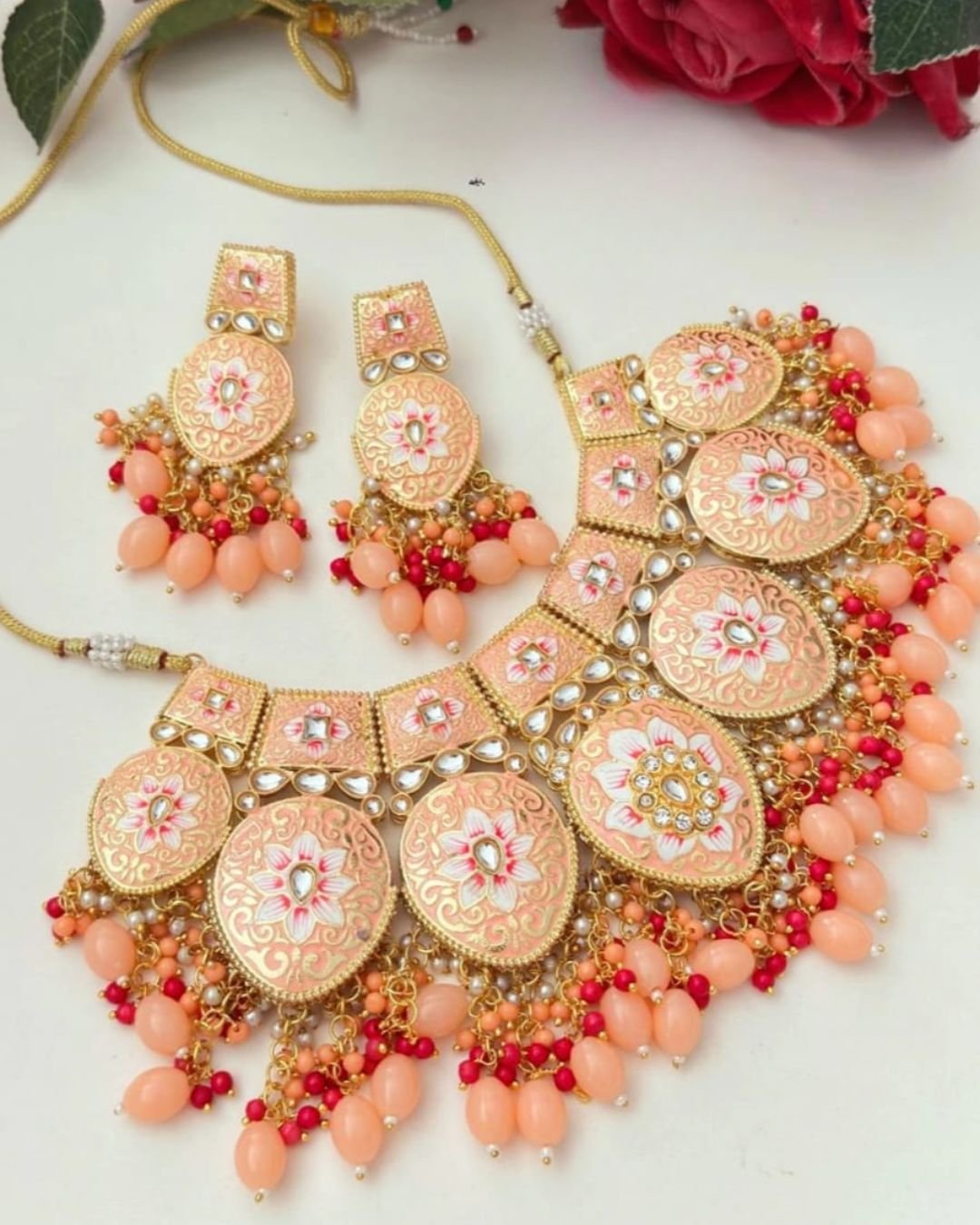 This set features intricate Meenakari enamel work in red and white with floral motifs, paired with Kundan detailing and red beaded drops for a bold and royal finish. It includes a statement choker-style necklace with a pair of matching heavy earrings, making it the perfect choice for brides and festive celebrations.