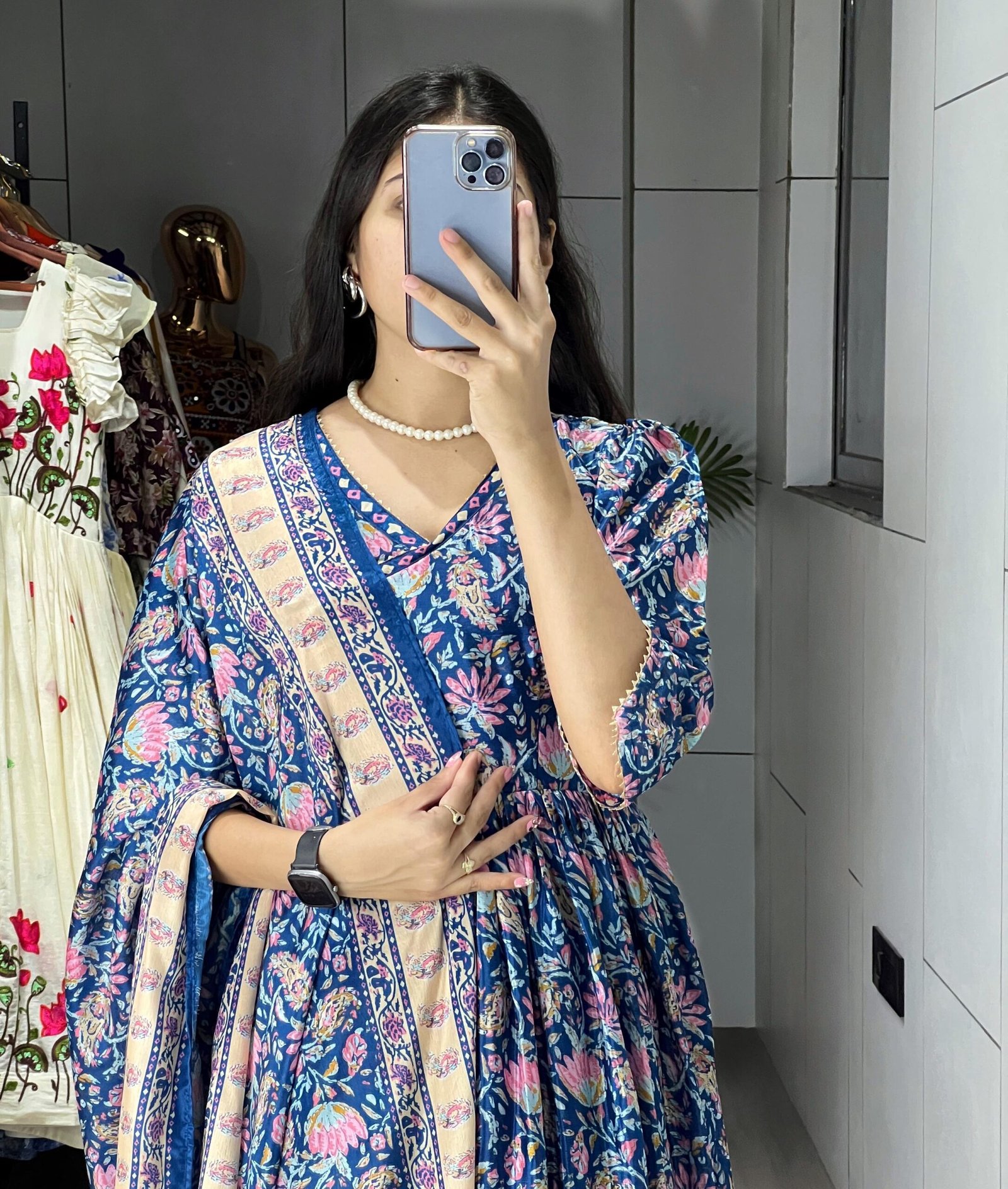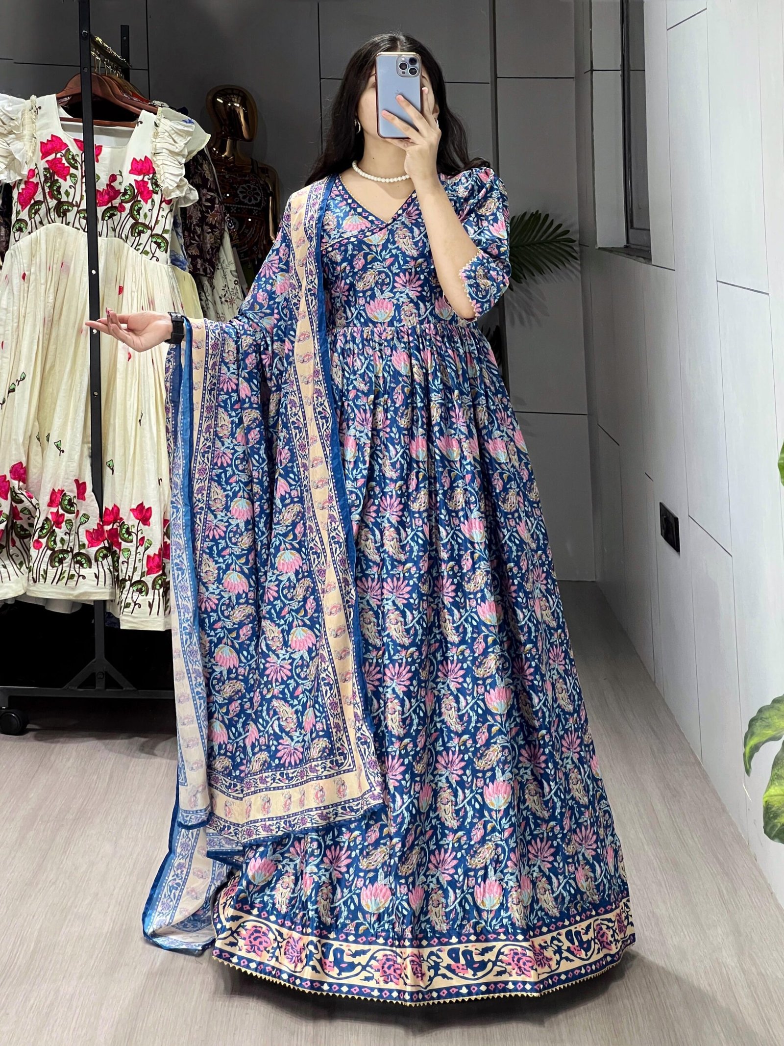 Blue Floral Printed Heavy Chinon Gown with Dupatta | Elegant Ethnic Wear for Women