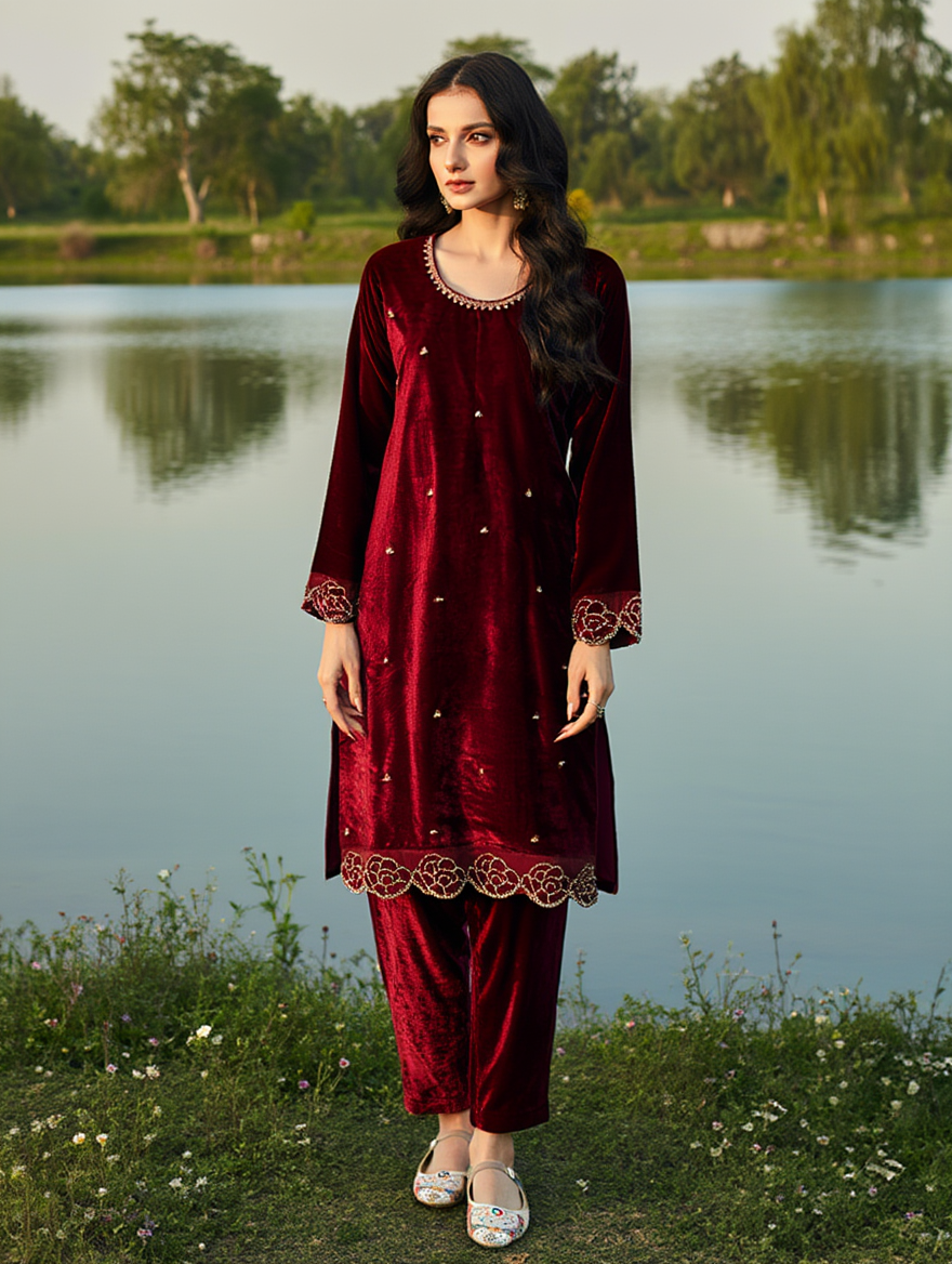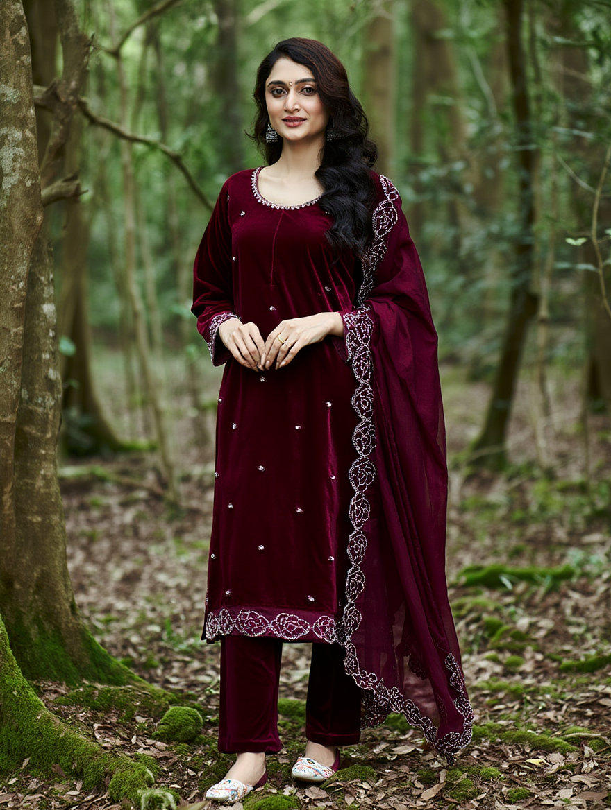 Unveil your luxurious side with Sajdeya’s Designer Maroon Velvet Suit Set, a masterpiece crafted from pure heavy viscose velvet fabric. The top features exquisite rhinestone (Zarkhan) and sequence embroidery work, radiating premium craftsmanship.