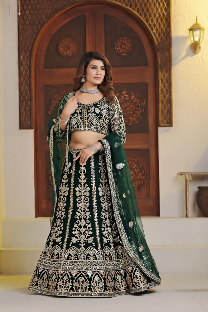 A true masterpiece of elegance and craftsmanship — this lehenga choli blends rich color tones with intricate embroidery, creating a regal bridal statement.