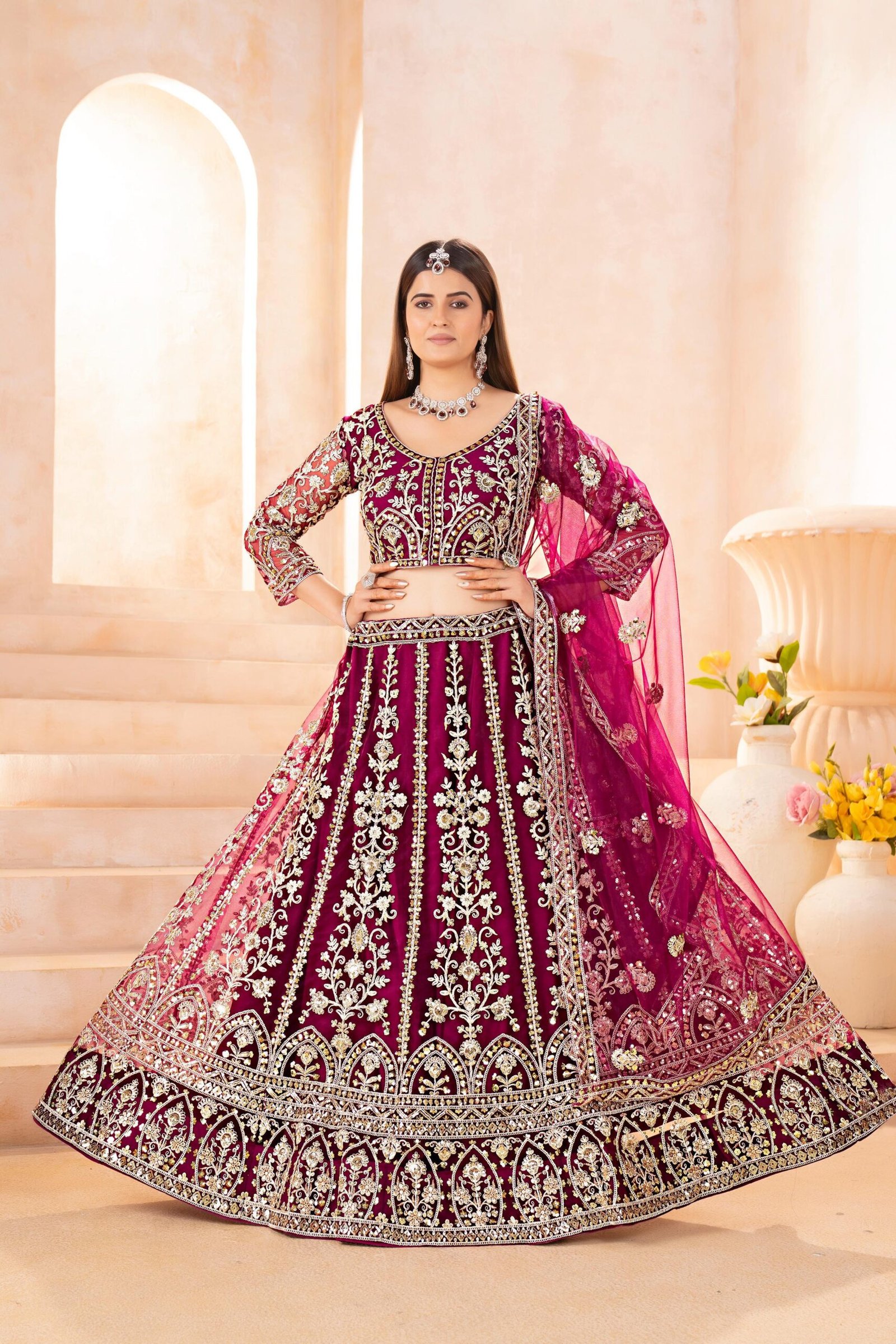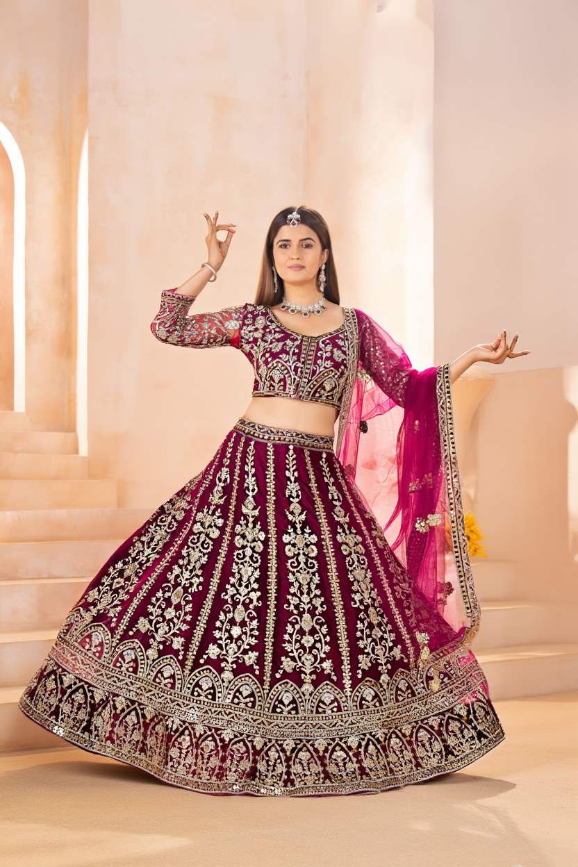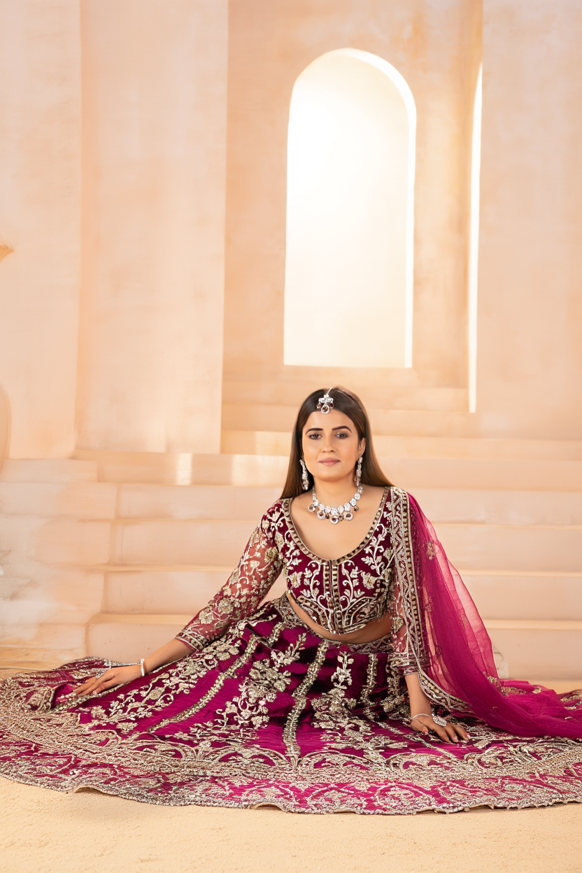 A breathtaking masterpiece blending rich color and intricate artistry — this wine lehenga choli is designed to turn every moment into a regal celebration.